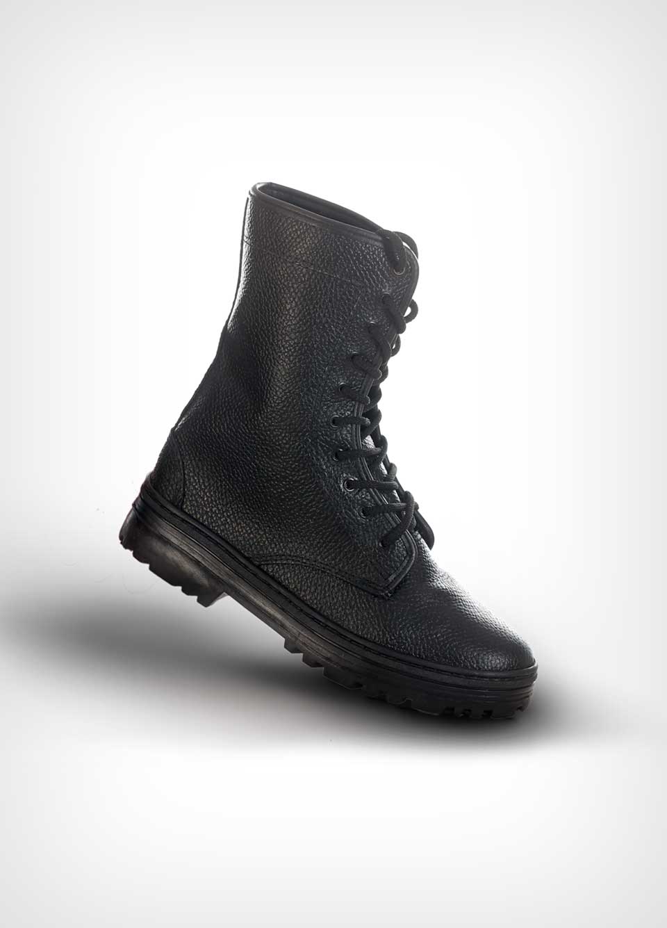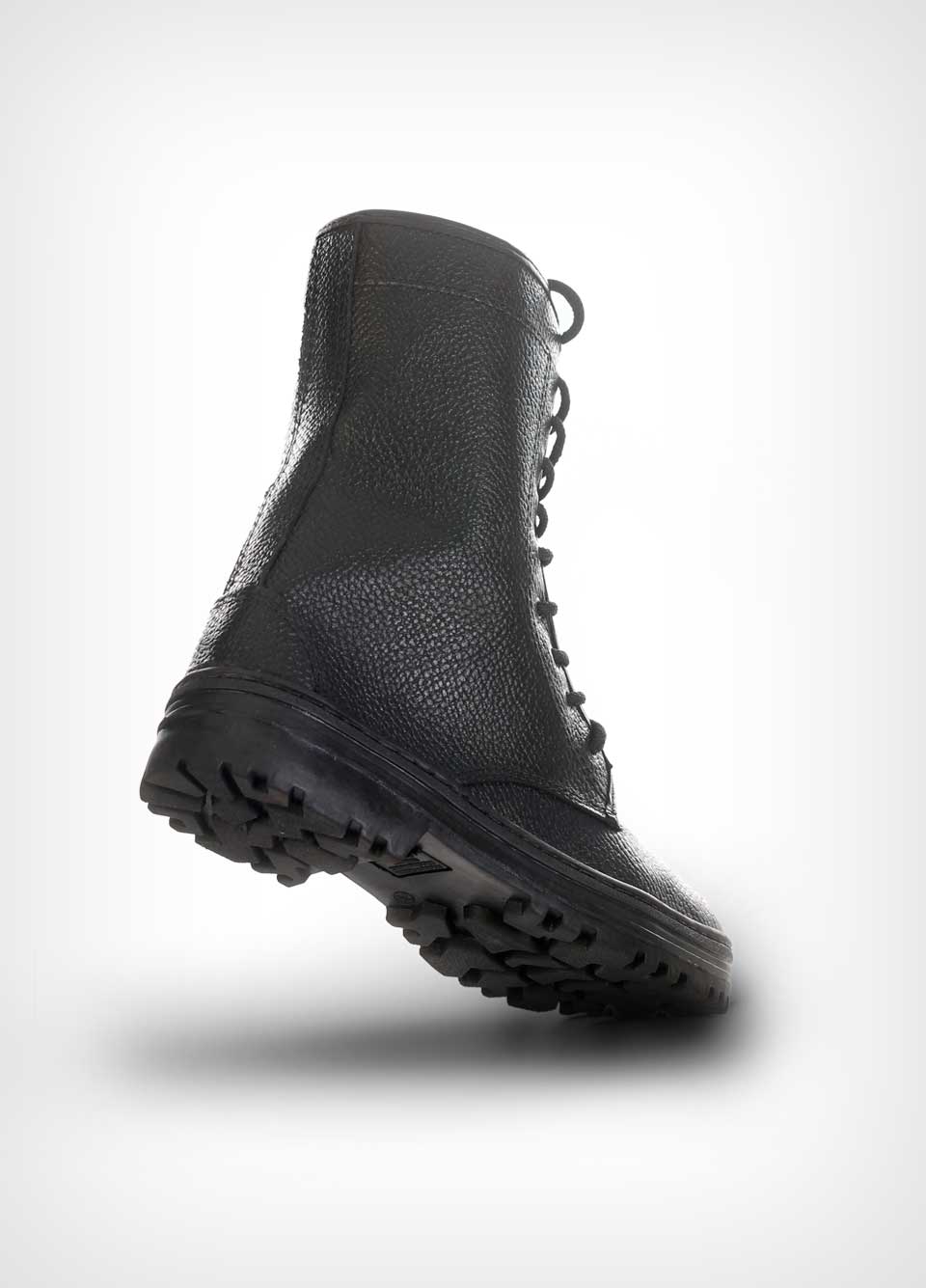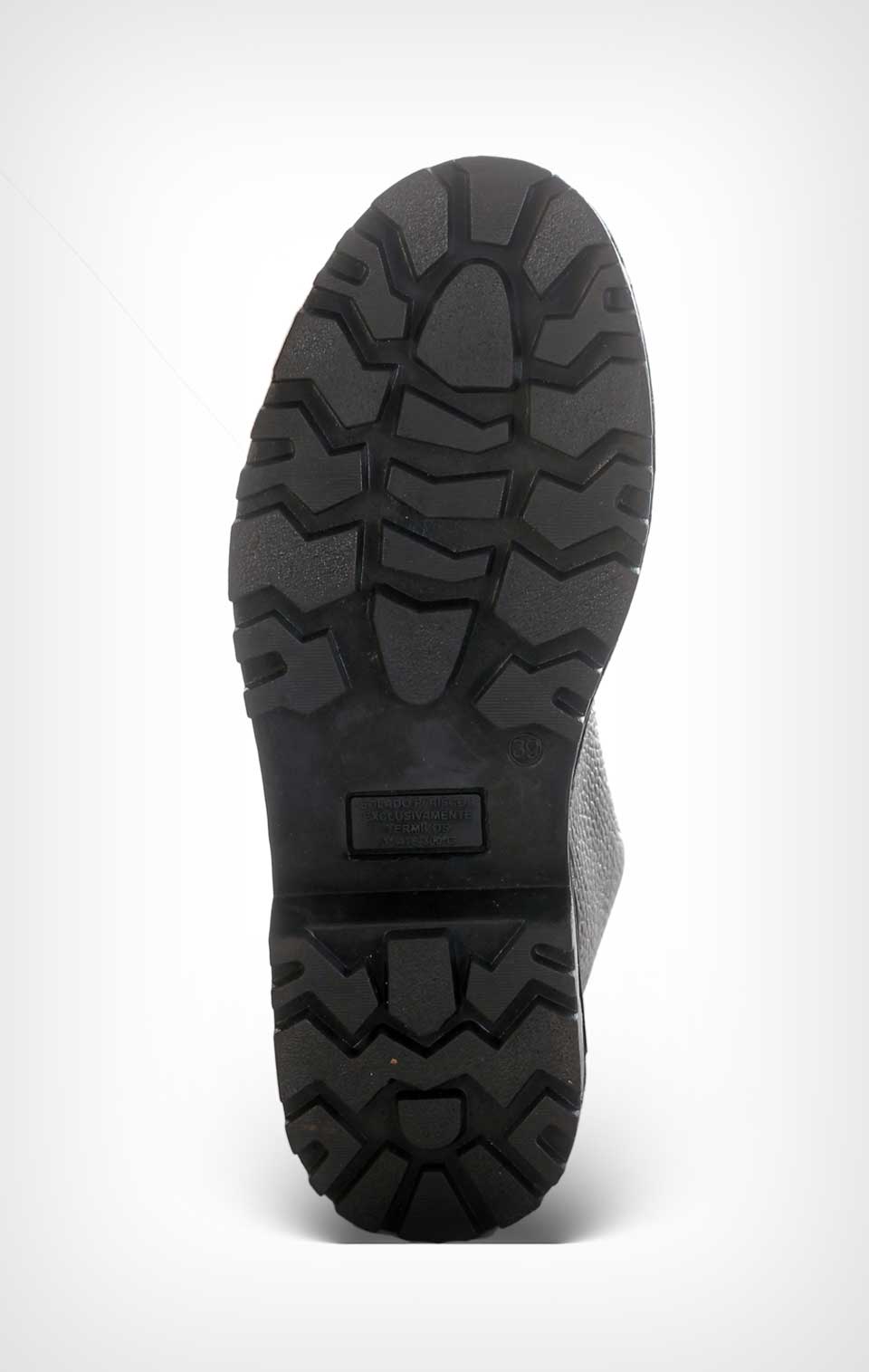 Sapato de Segurança Tipo Coturno Militar, ocupacional, tipo bota abaixo do joelho (coturno), confeccionado em couro preto com curtimento atravessado, 1.8/2.0mm linhas de espessuras, fechamento em cadarço, palmilha de montagem em não tecido fixada pelo sistema Strobel, forração em tecido não transpirável, solado modelo Borracha colado e costurado (blaqueado), resistente a objetos cortantes, perfurantes e abrasão.