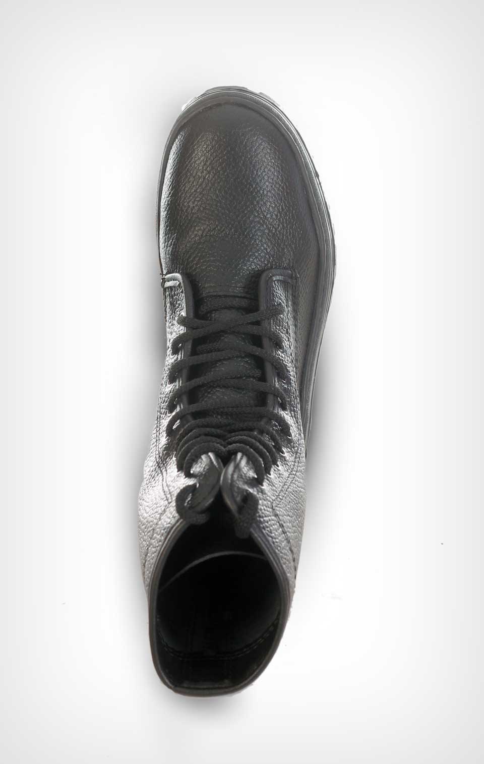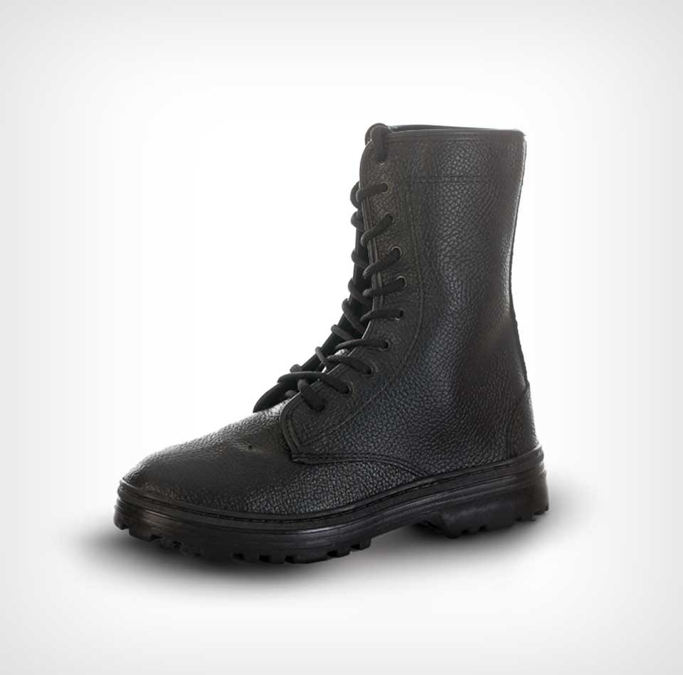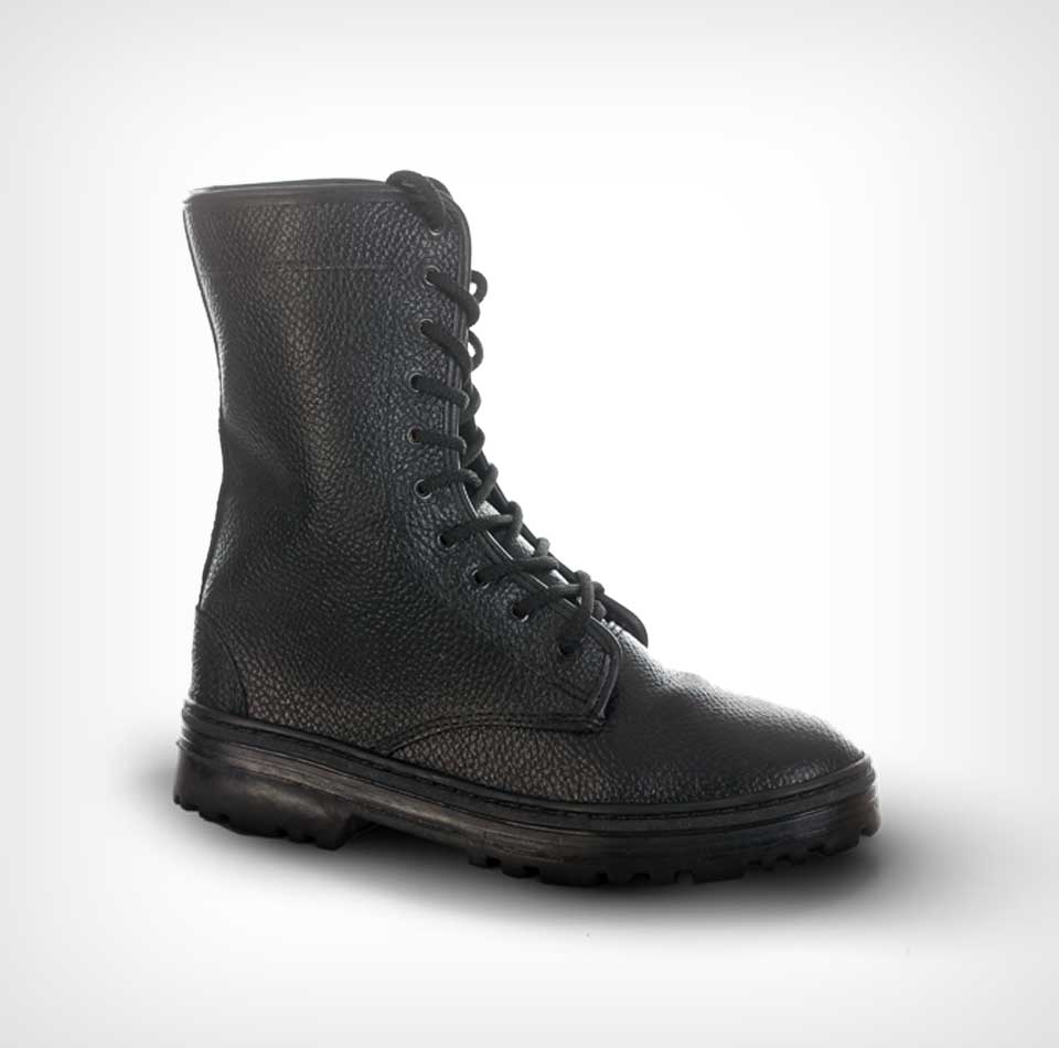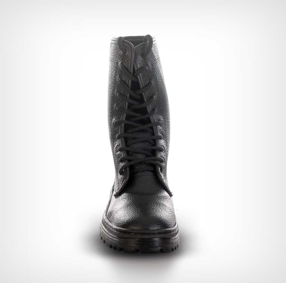 Sapato de Segurança Tipo Coturno Militar, ocupacional, tipo bota abaixo do joelho (coturno), confeccionado em couro preto com curtimento atravessado, 1.8/2.0mm linhas de espessuras, fechamento em cadarço, palmilha de montagem em não tecido fixada pelo sistema Strobel, forração em tecido não transpirável, solado modelo Borracha colado e costurado (blaqueado), resistente a objetos cortantes, perfurantes e abrasão.